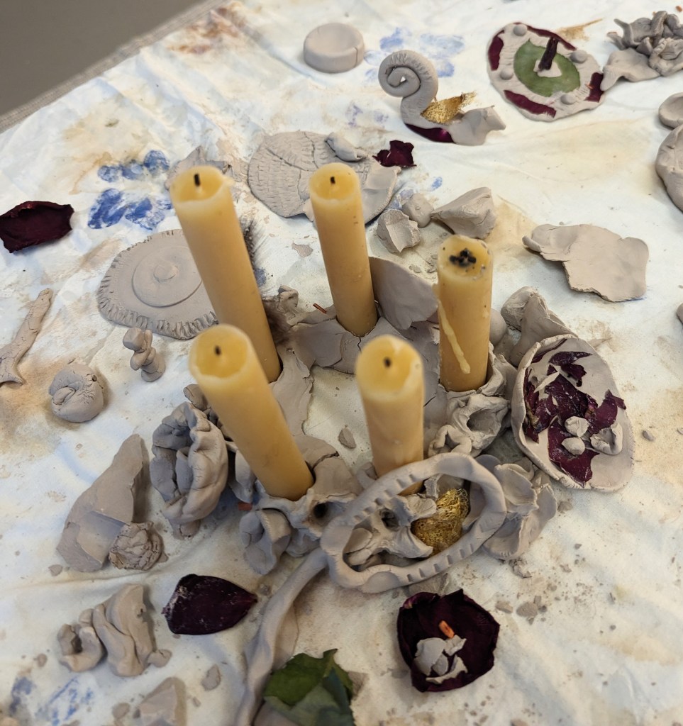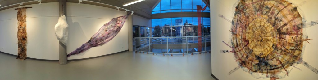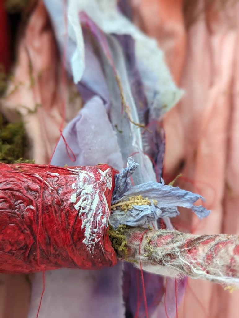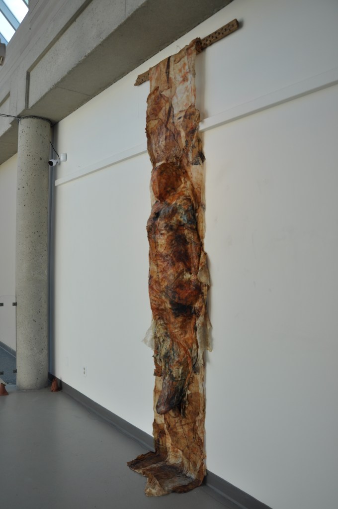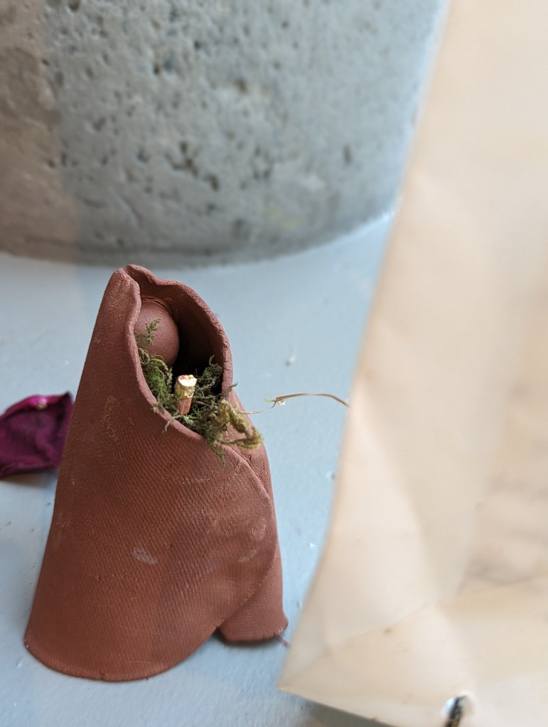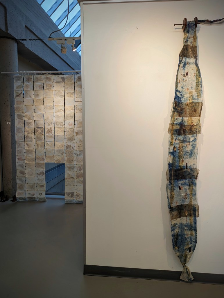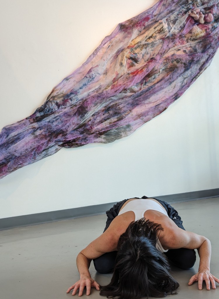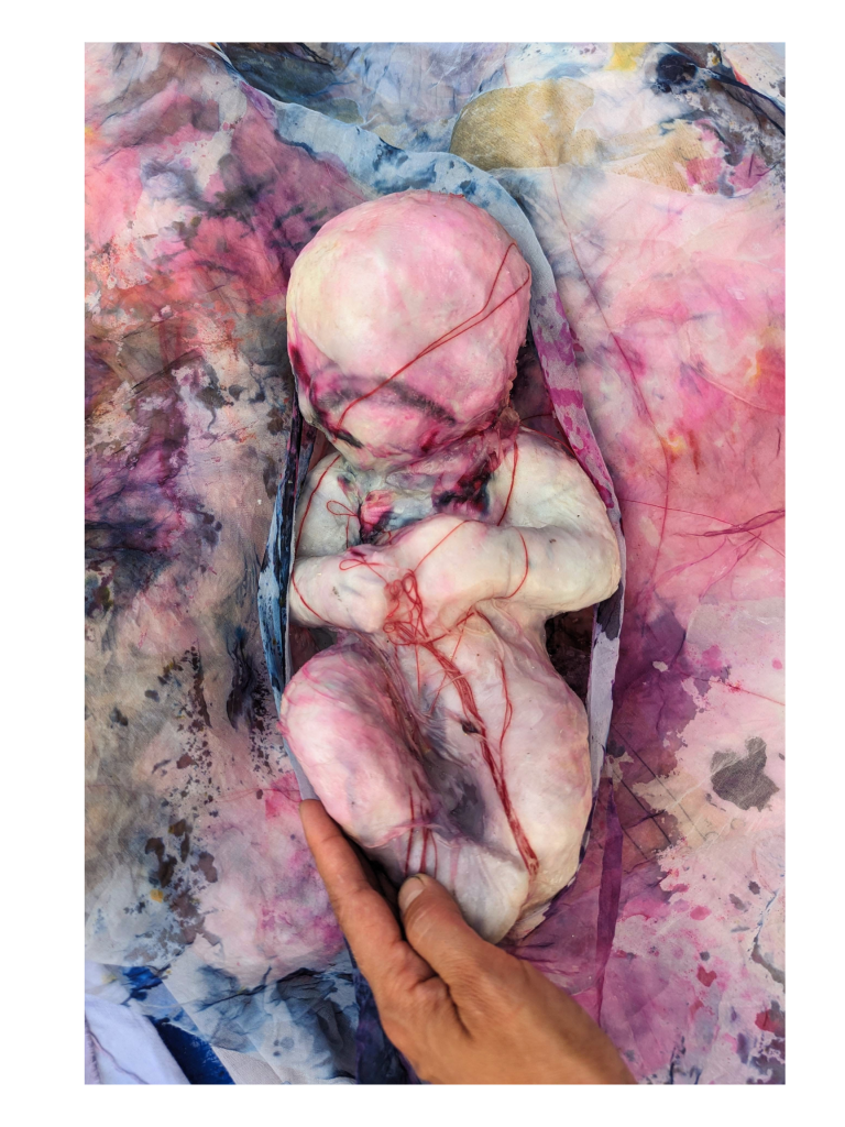 Homecoming exhibited Sept 13-Oct 11, 2023 at Dal Schindell Gallery on the stolen, unceded land of the Musqueam Nation, also known as UBC campus. ‘Homecoming’ is an exploration, a meditation on ‘becoming human’ and what it means to live as intra-beings (Thich Nhat Hanh, 2017 & Daniel Siegel, 2022 ). In ‘Homecoming’ each piece is an experiment, a response, a conversation that I have had both with self, environment and ‘other’ and has been co-created through a process involving embodied listening, making, writing, and sharing. Materials used throughout the storytelling process are a unique mixture of encaustic wax mediums, hand-dyed silks, clay, plaster and watercolours.